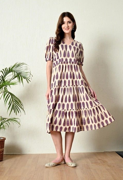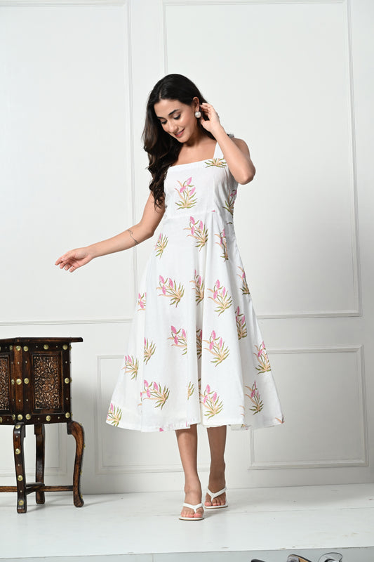 White Hand block Printed A line dress