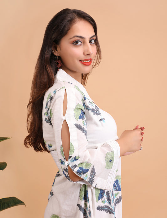 White Handblock Printed Long Kurta with green cropped jacket