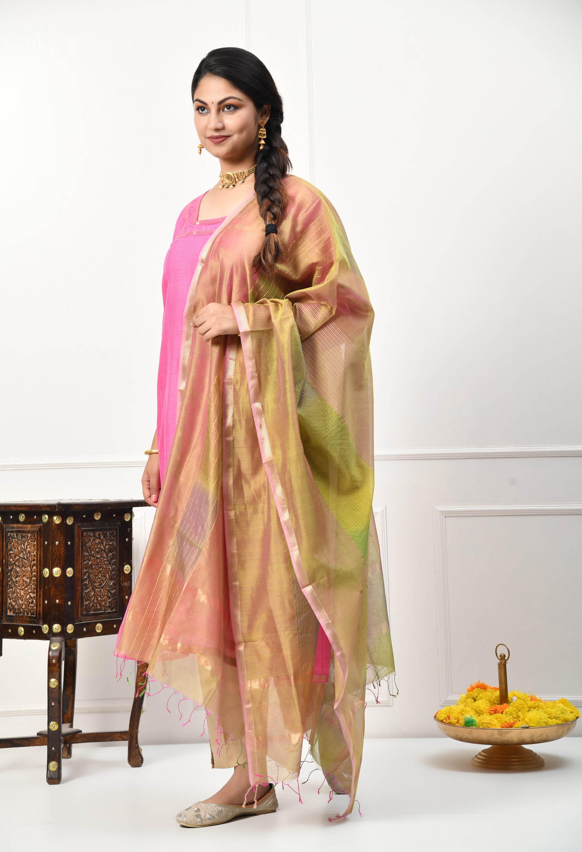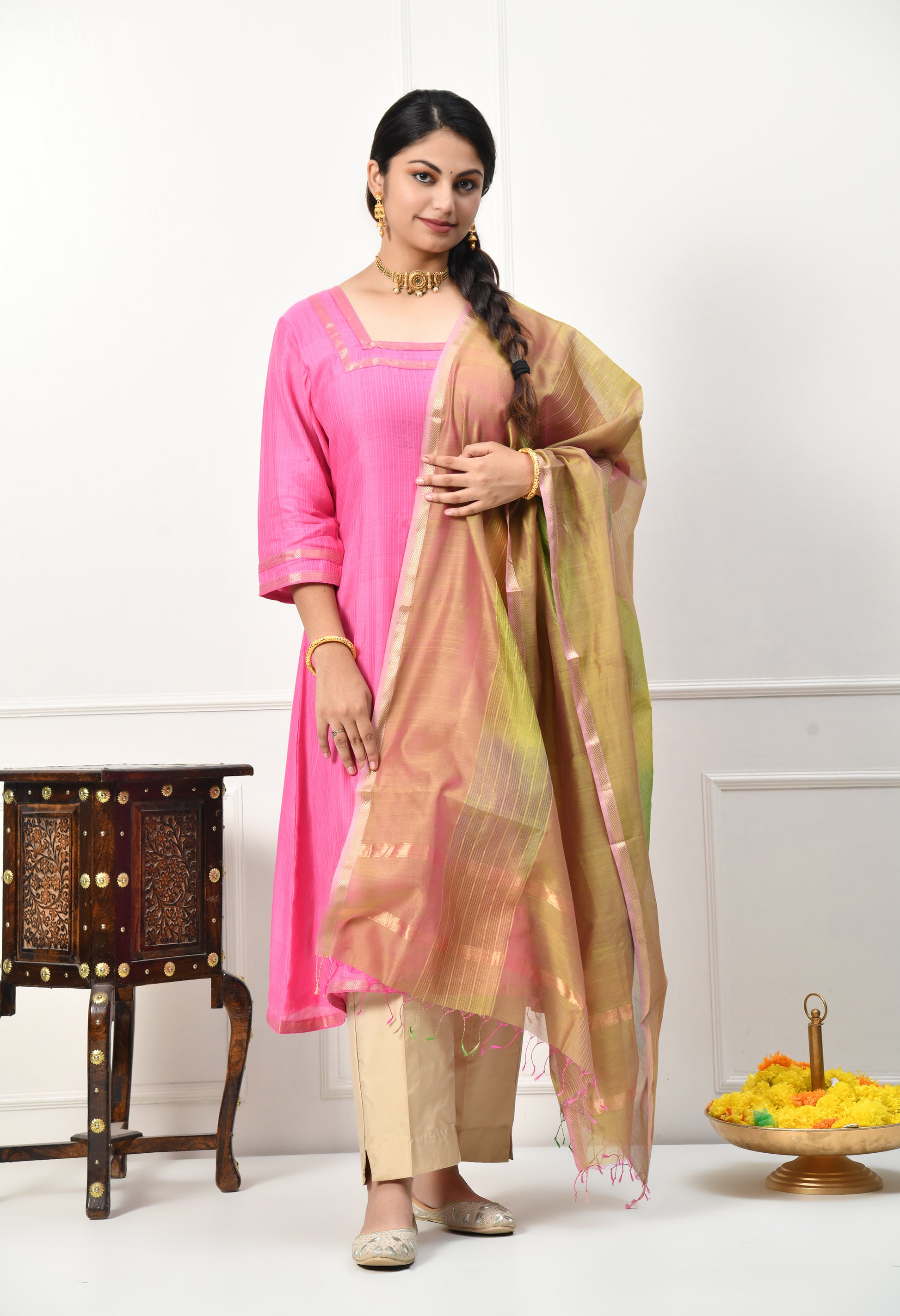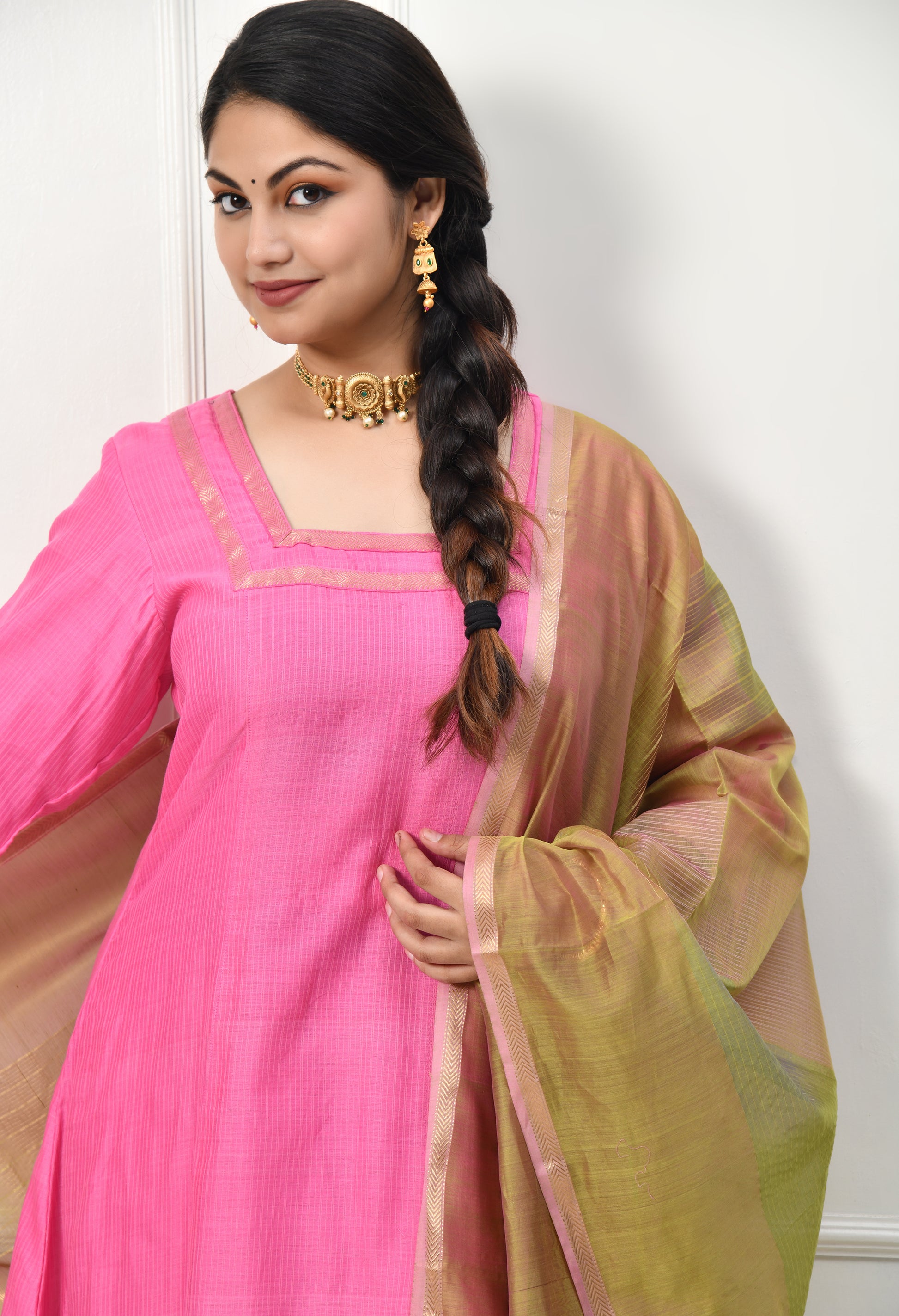 Maheshwari Handloom Silk Cotton Pink Kurta and Dupatta with Zari Border