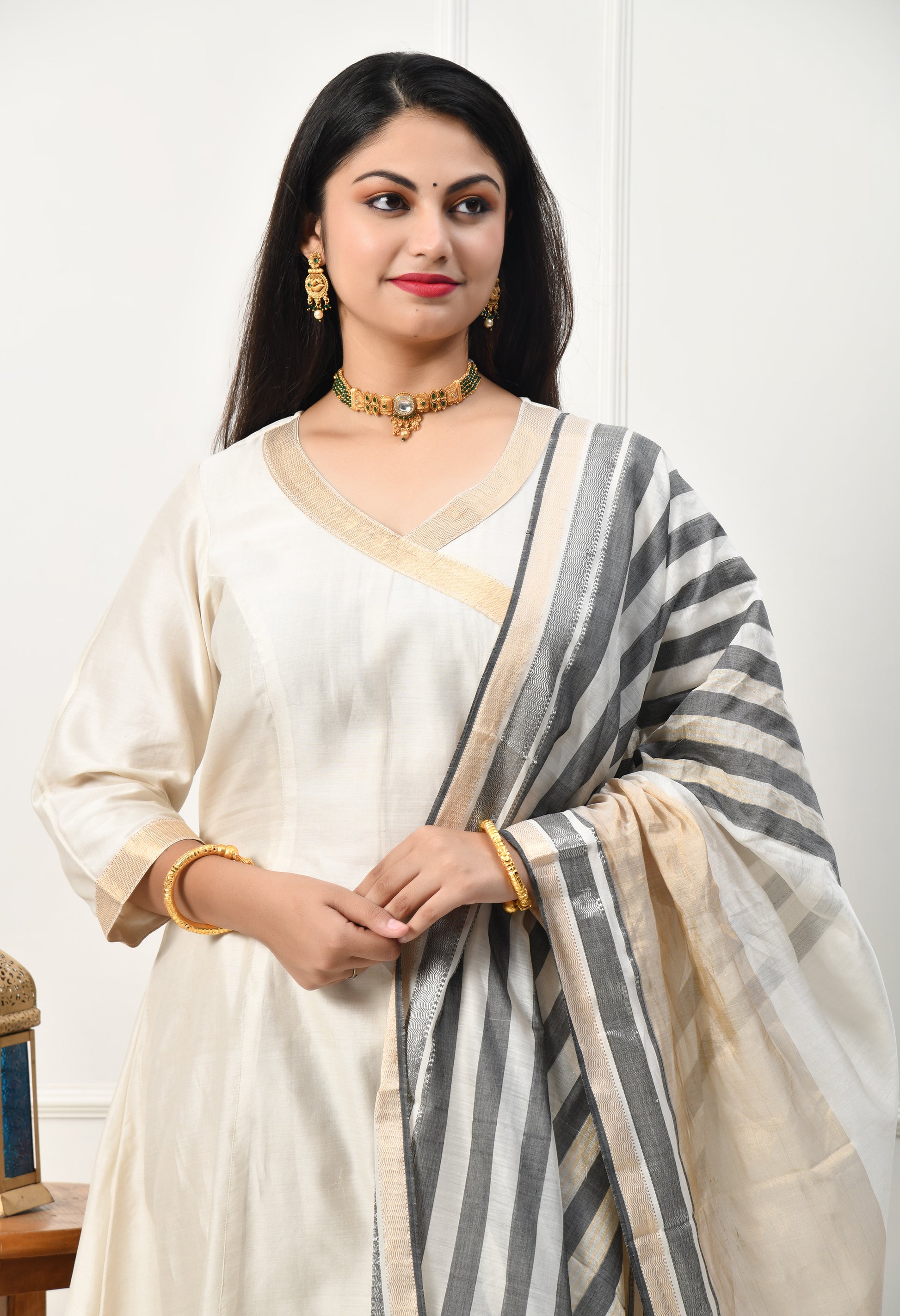 Maheshwari Handloom Silk Cotton White Kurta and Dupatta with Zari Border