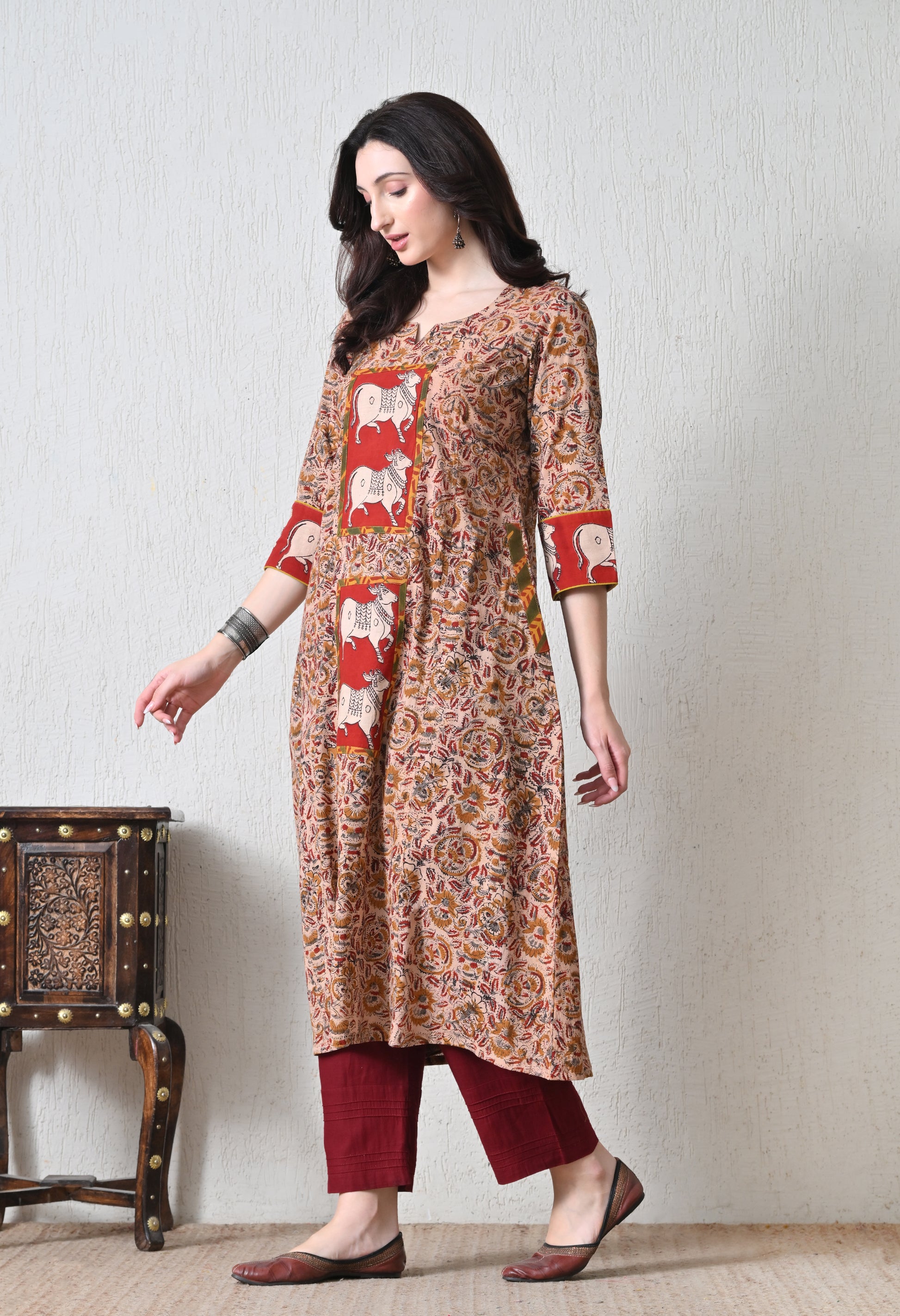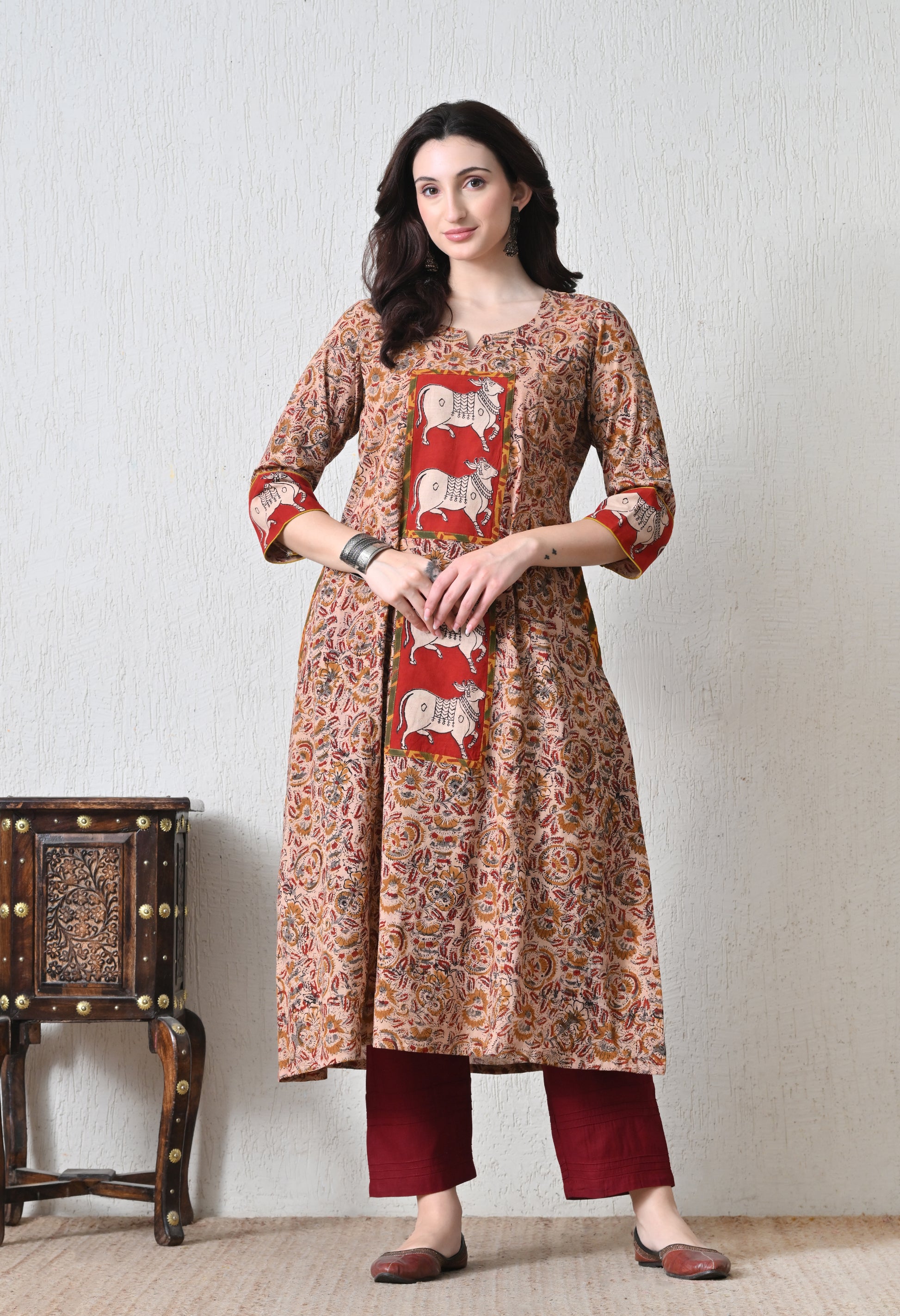 Beige and Maroon Kalamkari Handblock Cotton Kurta