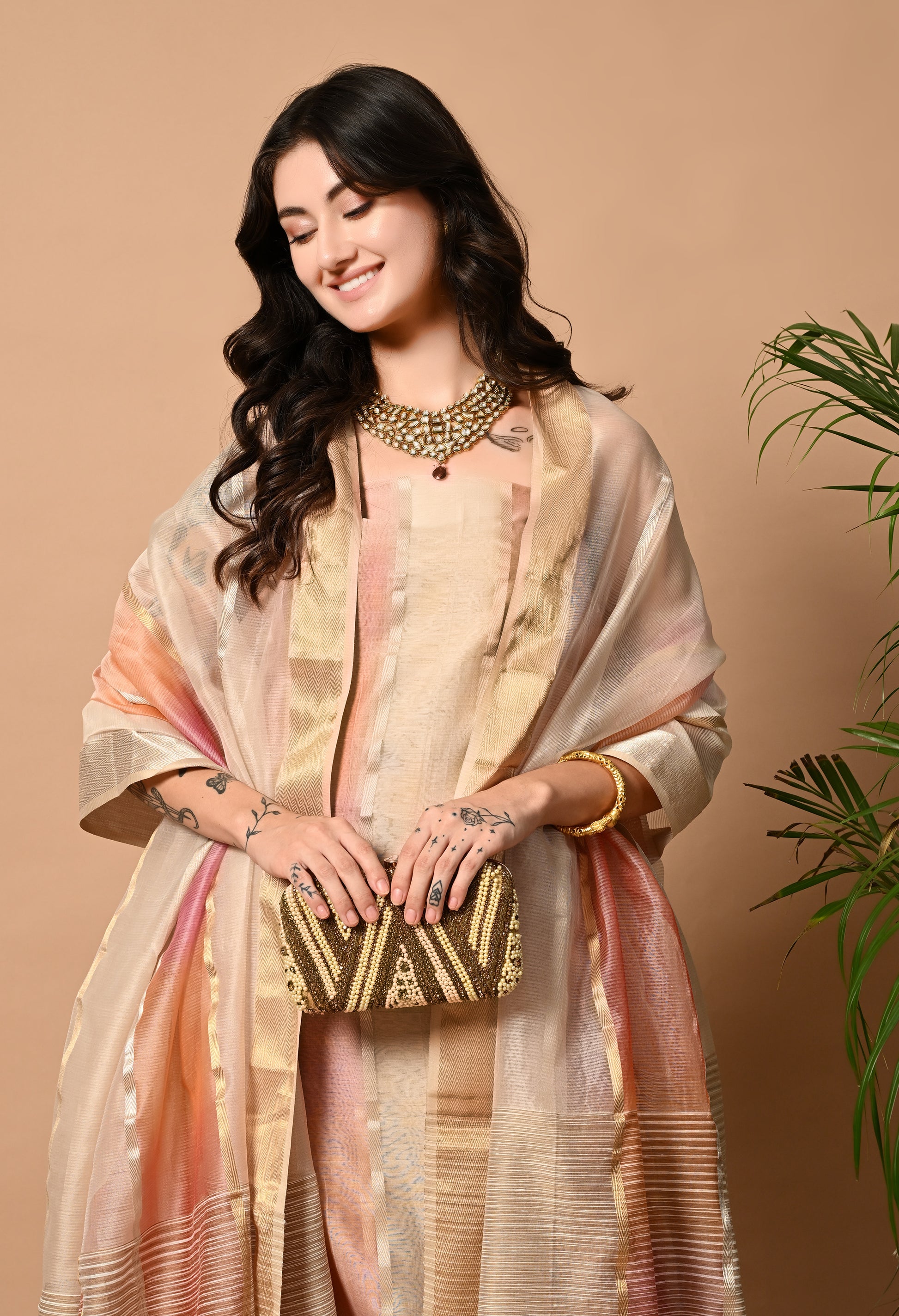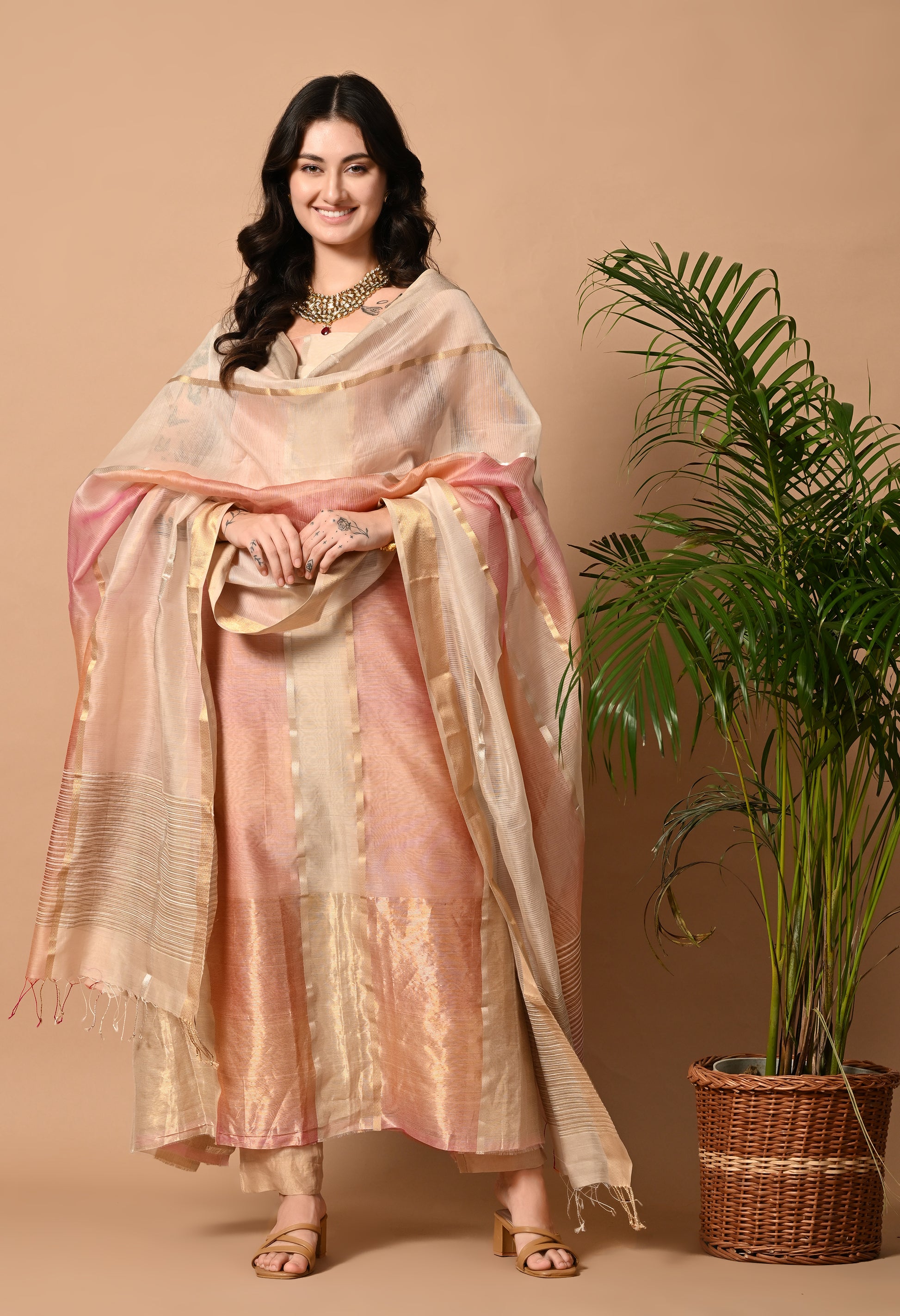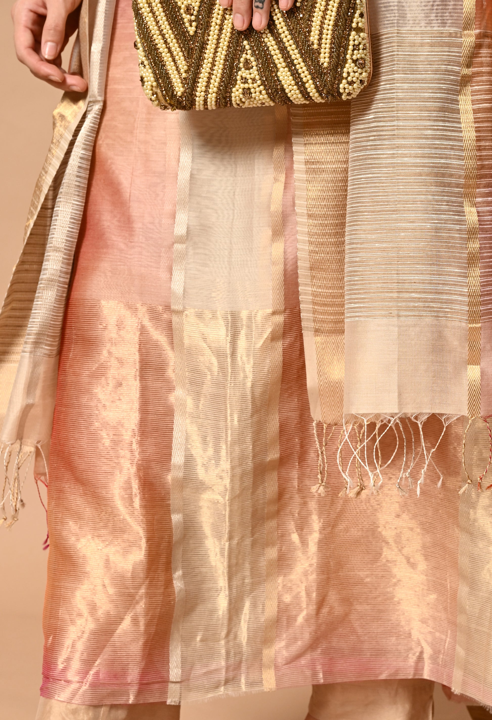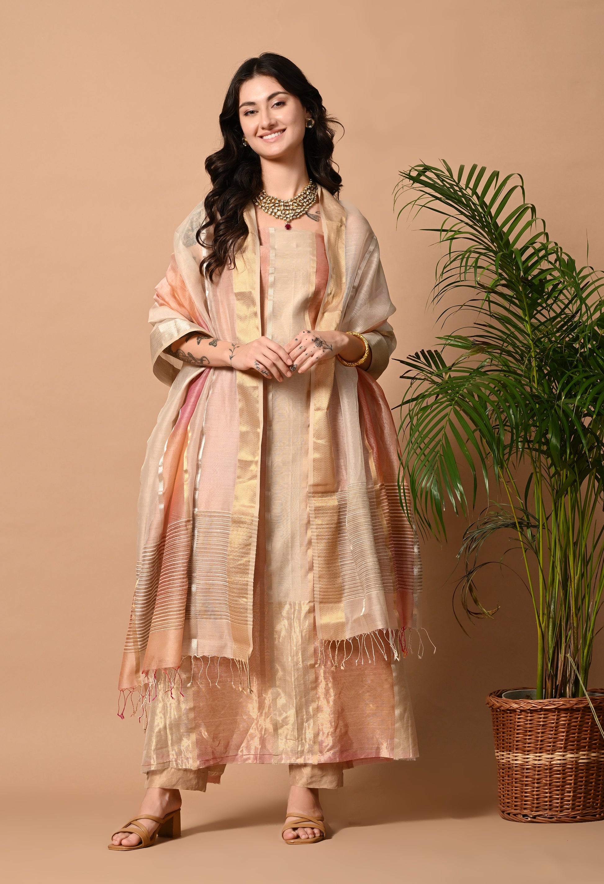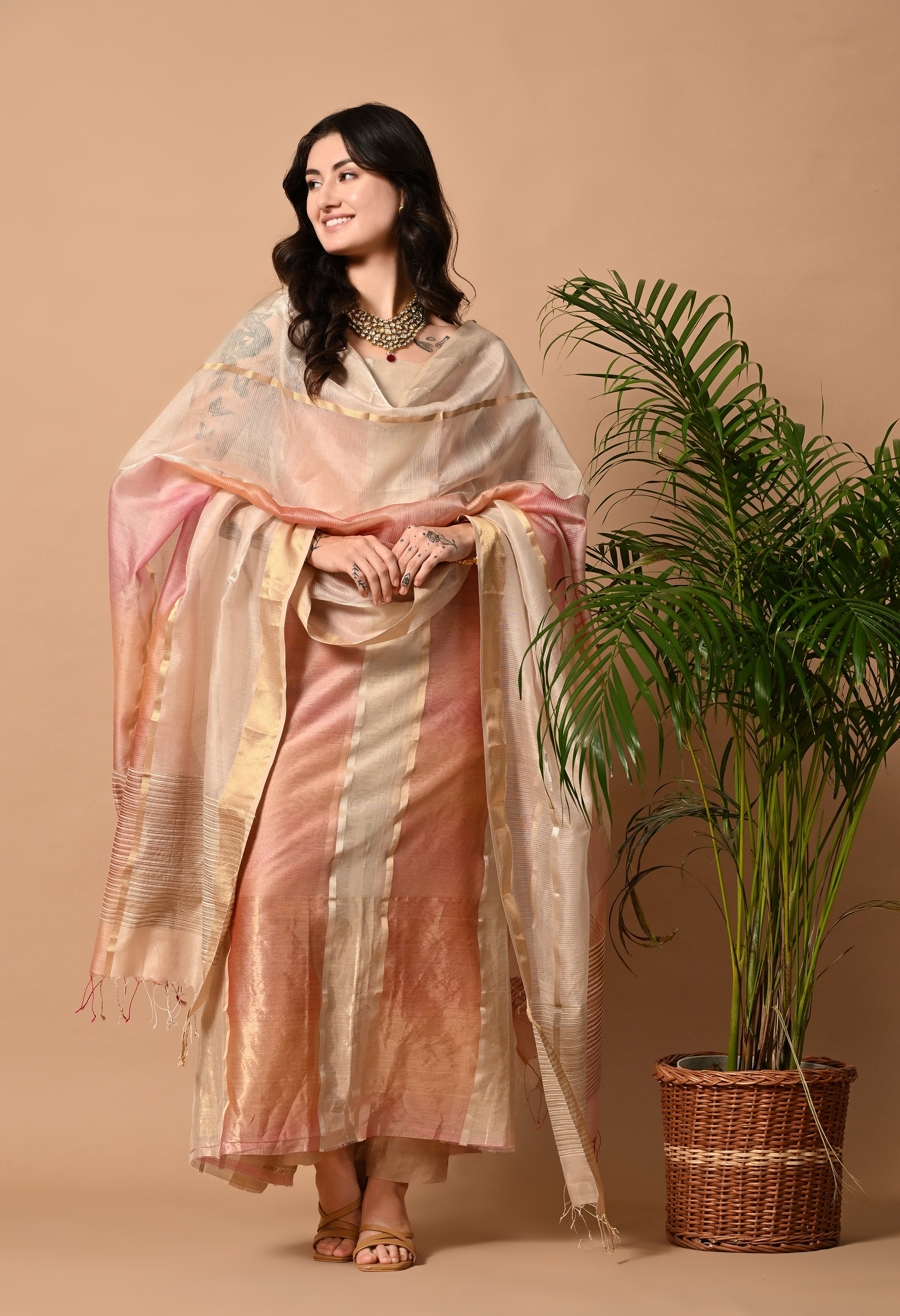 Bej and Pink Maheshwari Silk ,Zari and Cotton Handloom Kurta Material with Dupatta