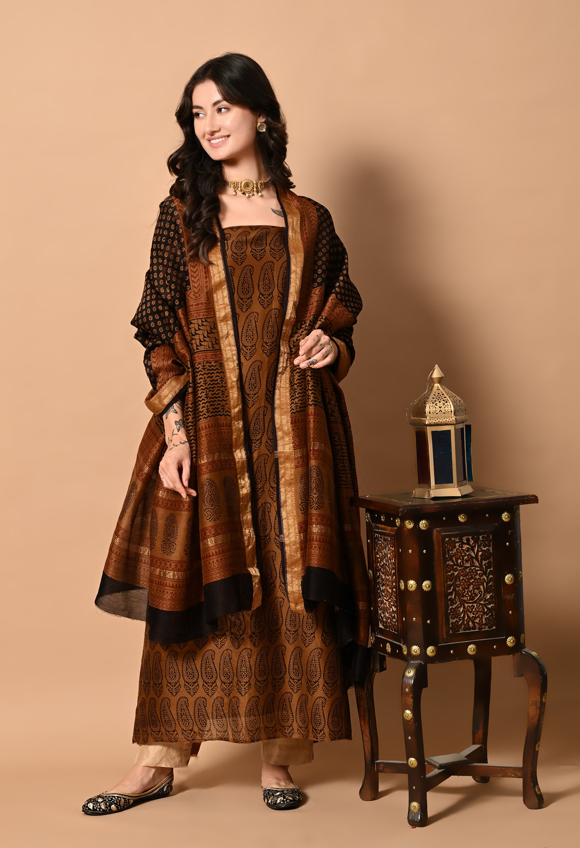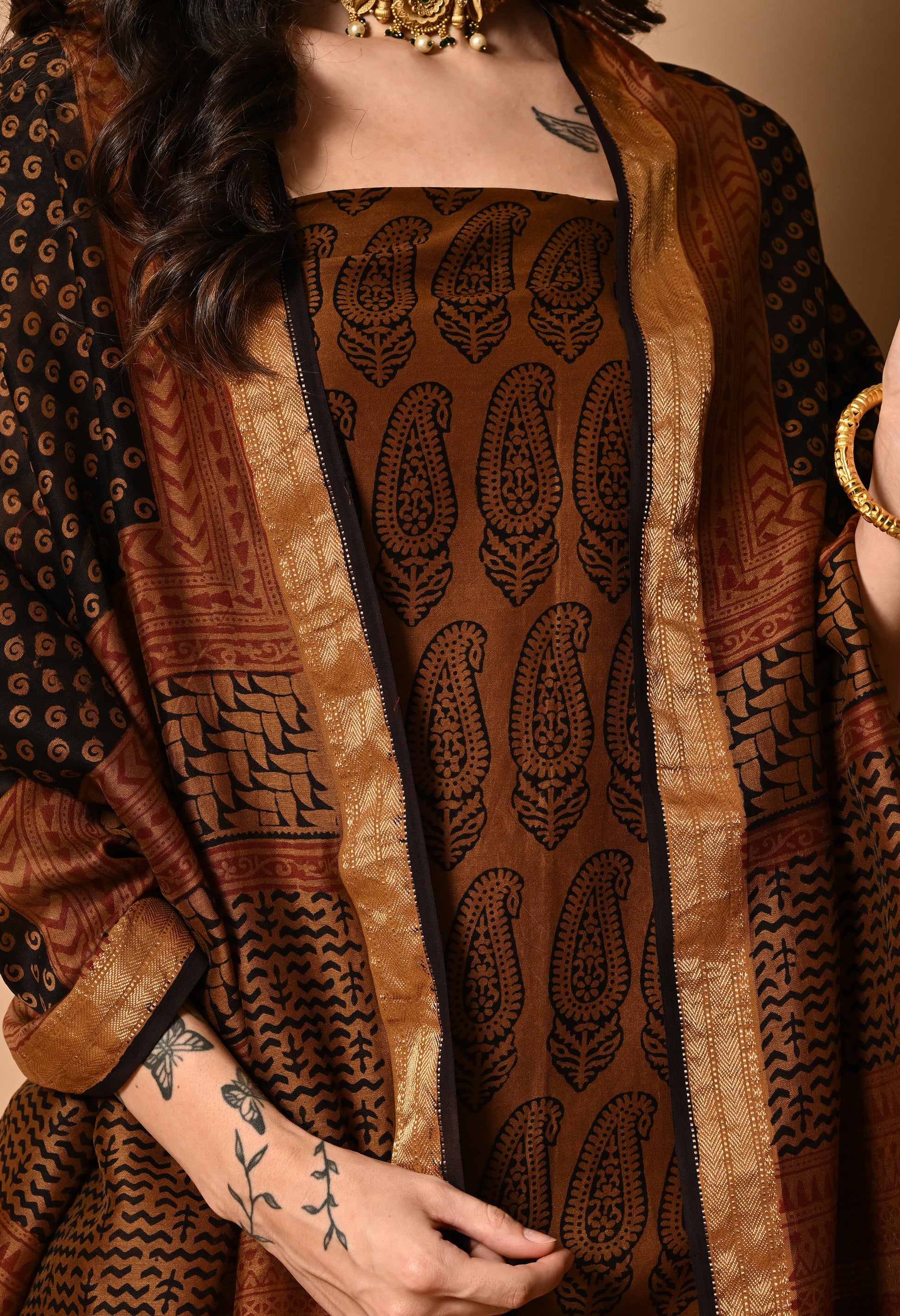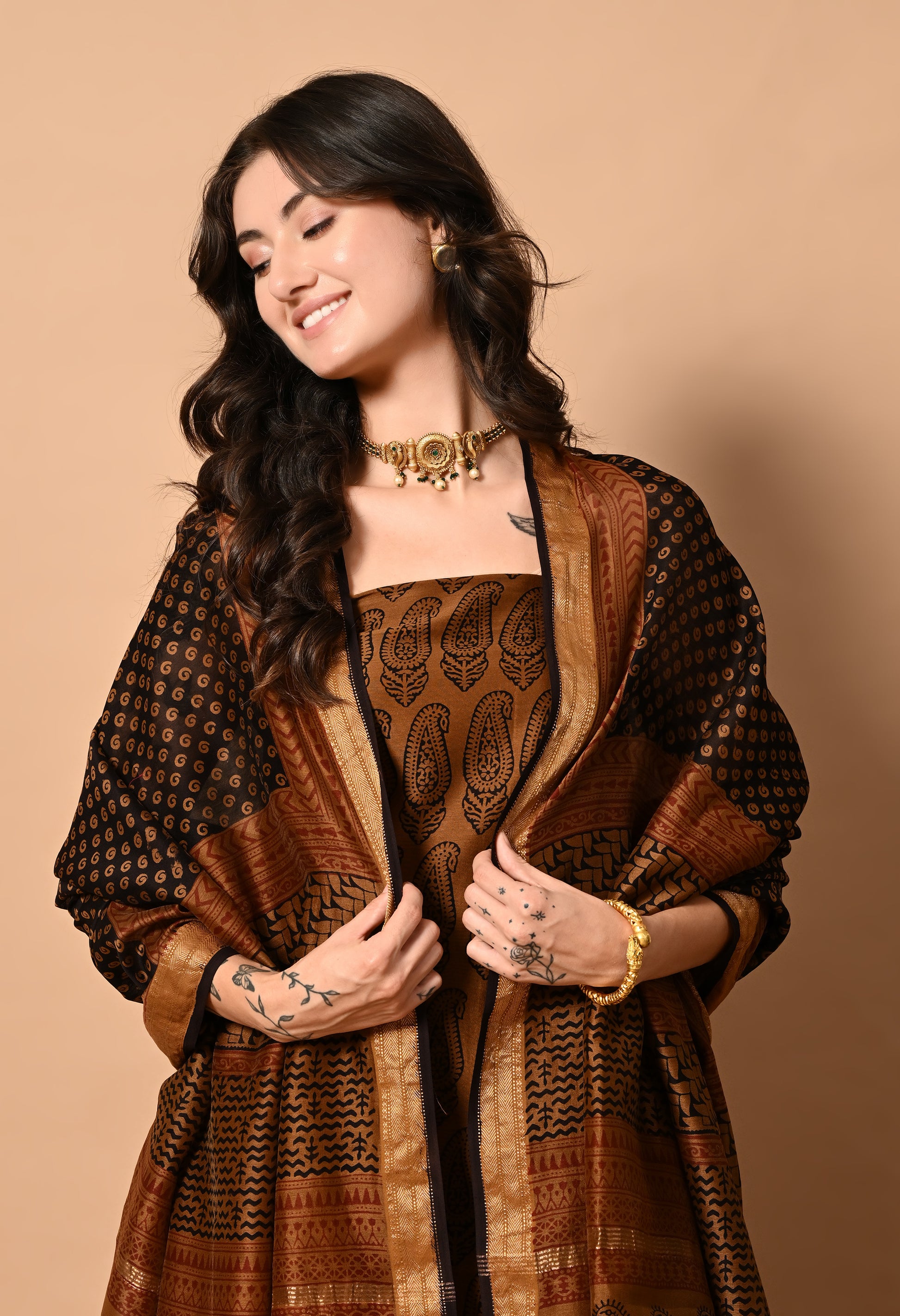 Black Bagh Hand Block Printed Silk Cotton Handloom Kurta Material and Dupatta