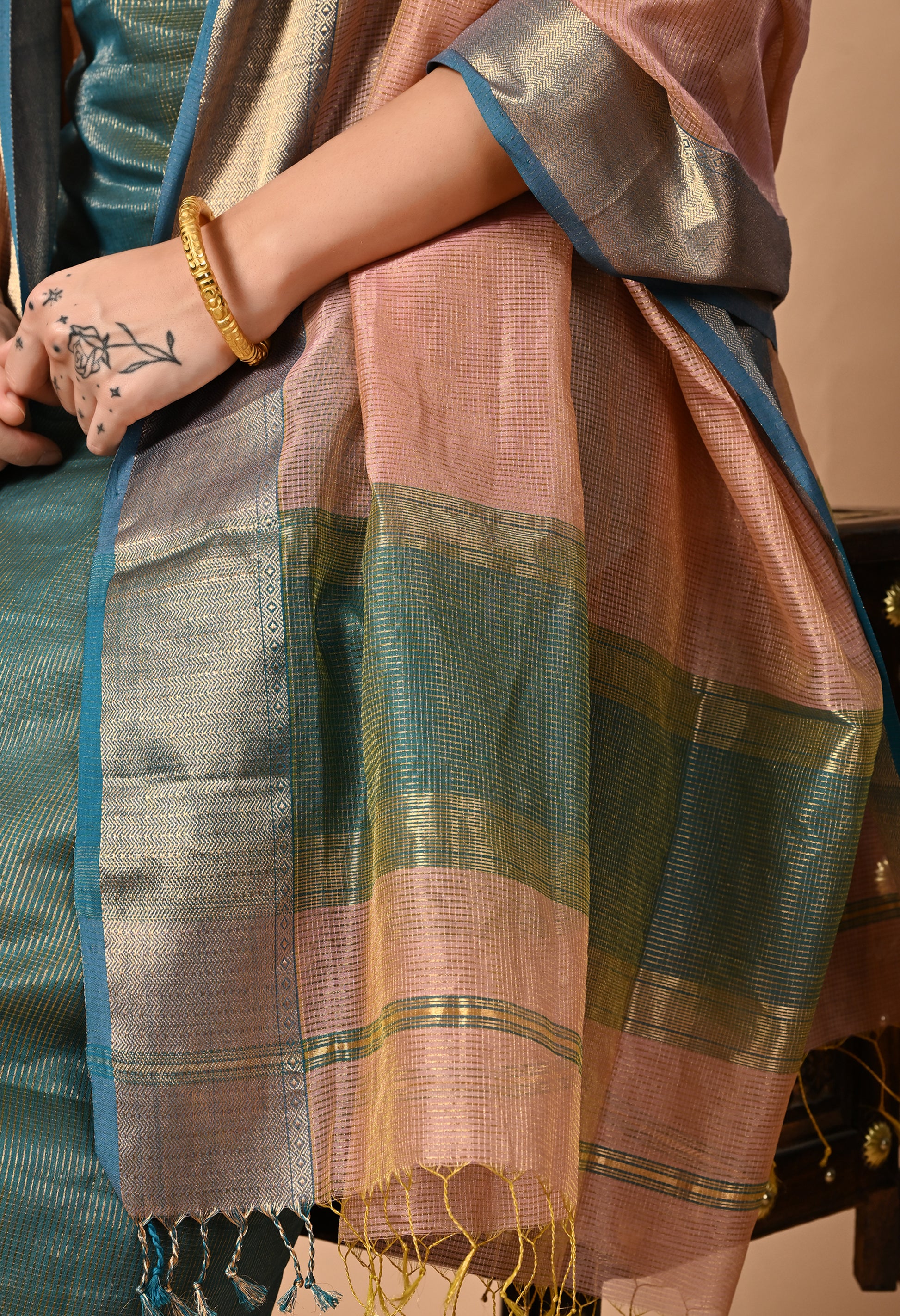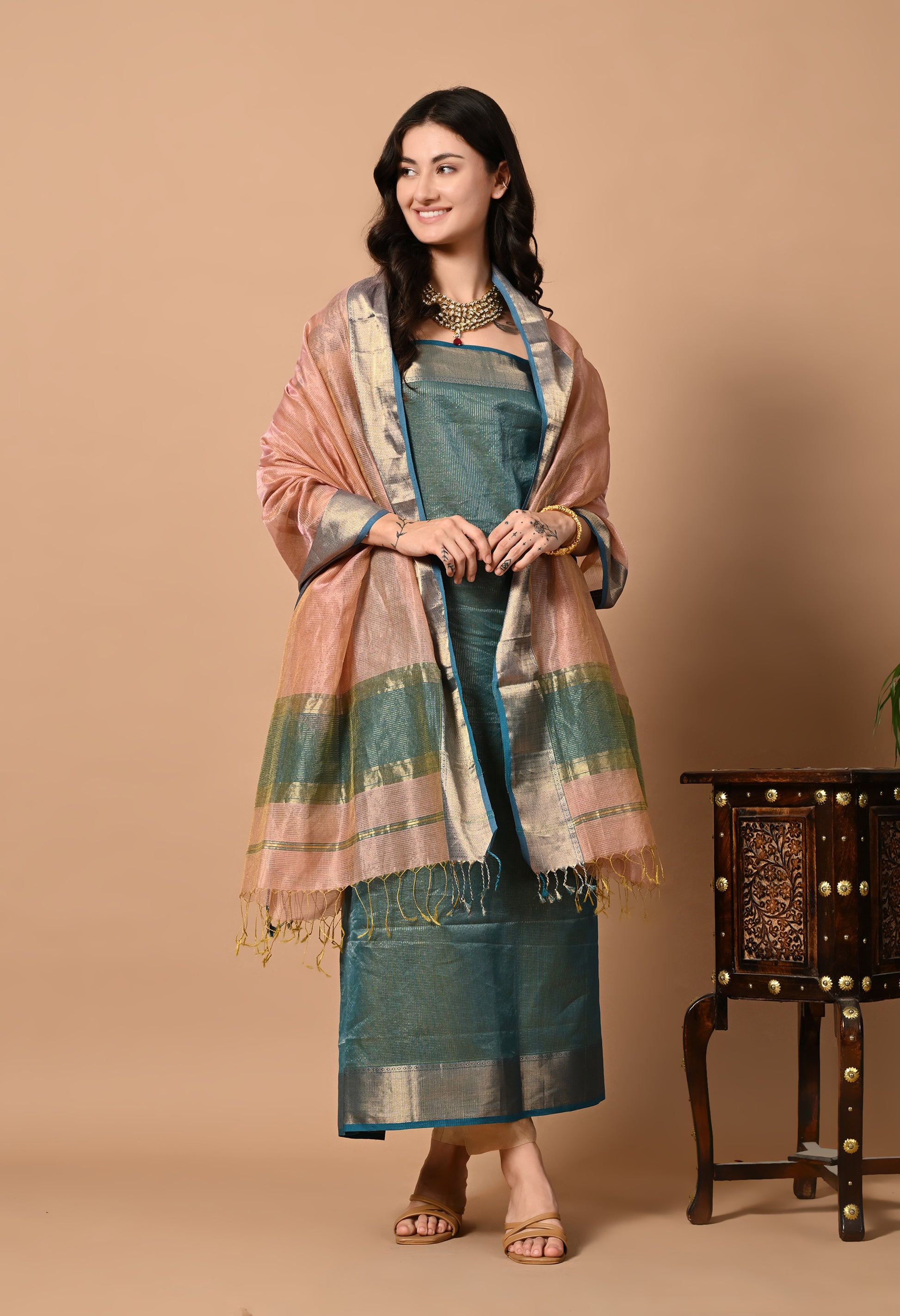 Blue Maheshwari Handloom Silk Zari and Cotton Kurta Material with Dupatta