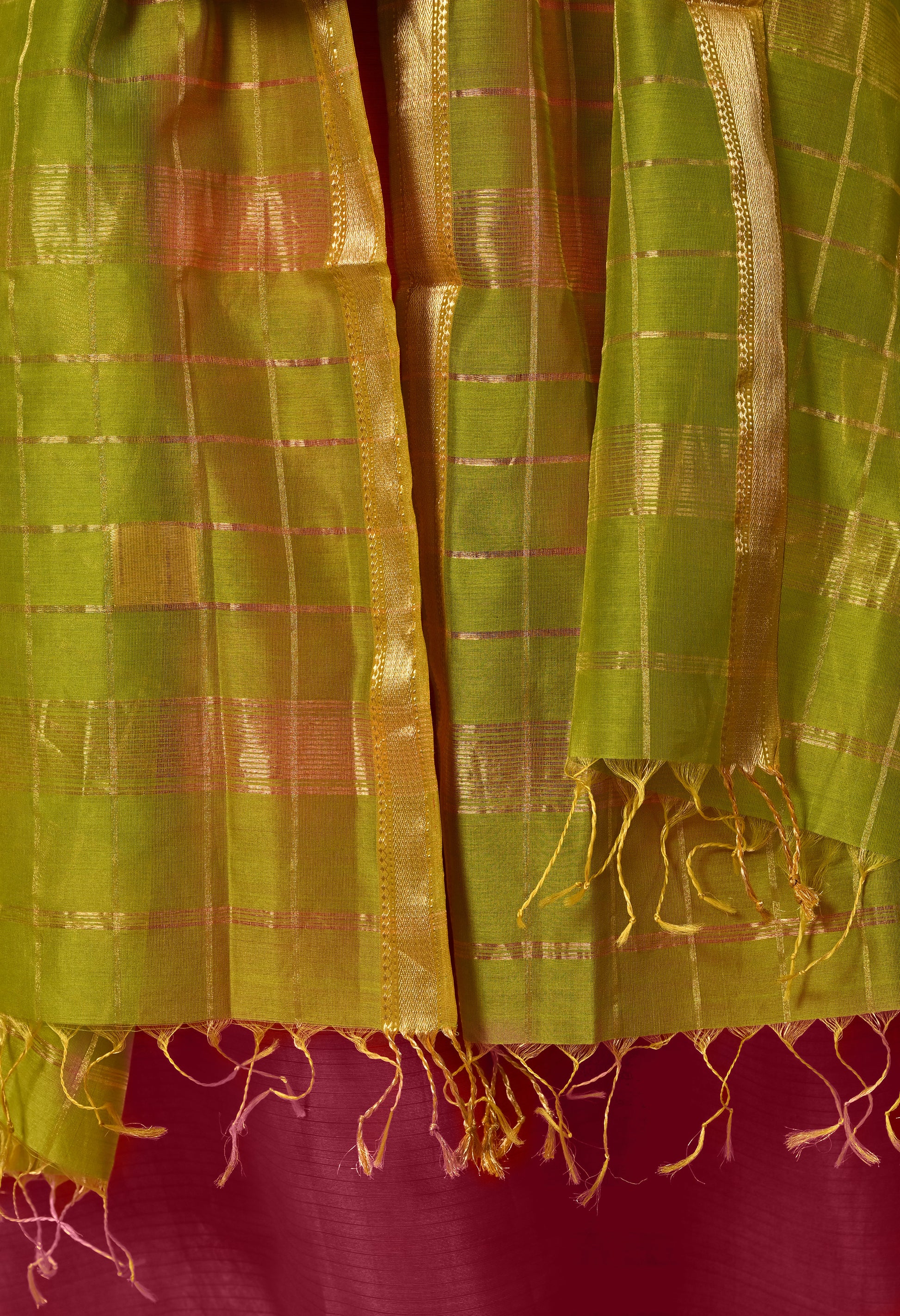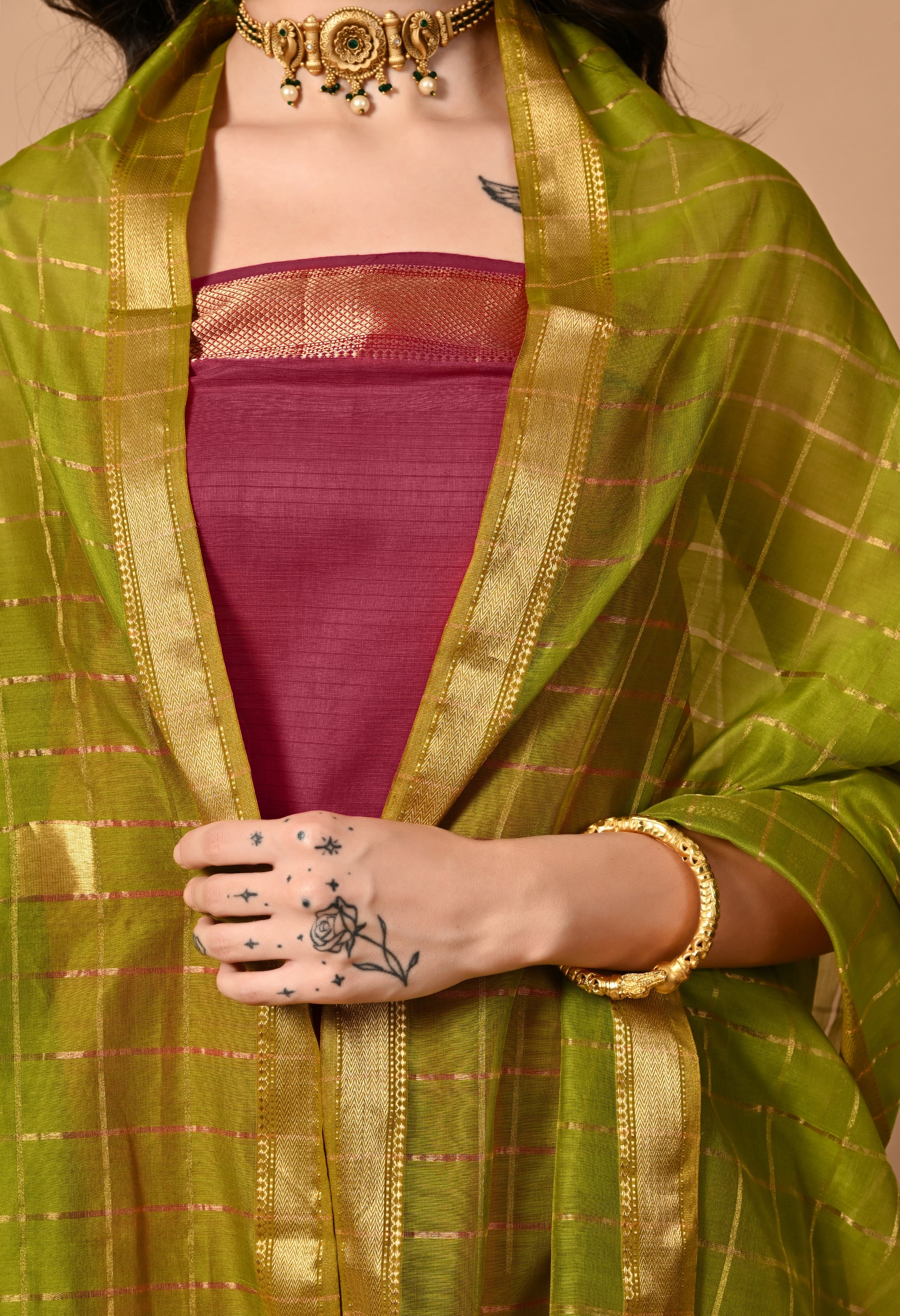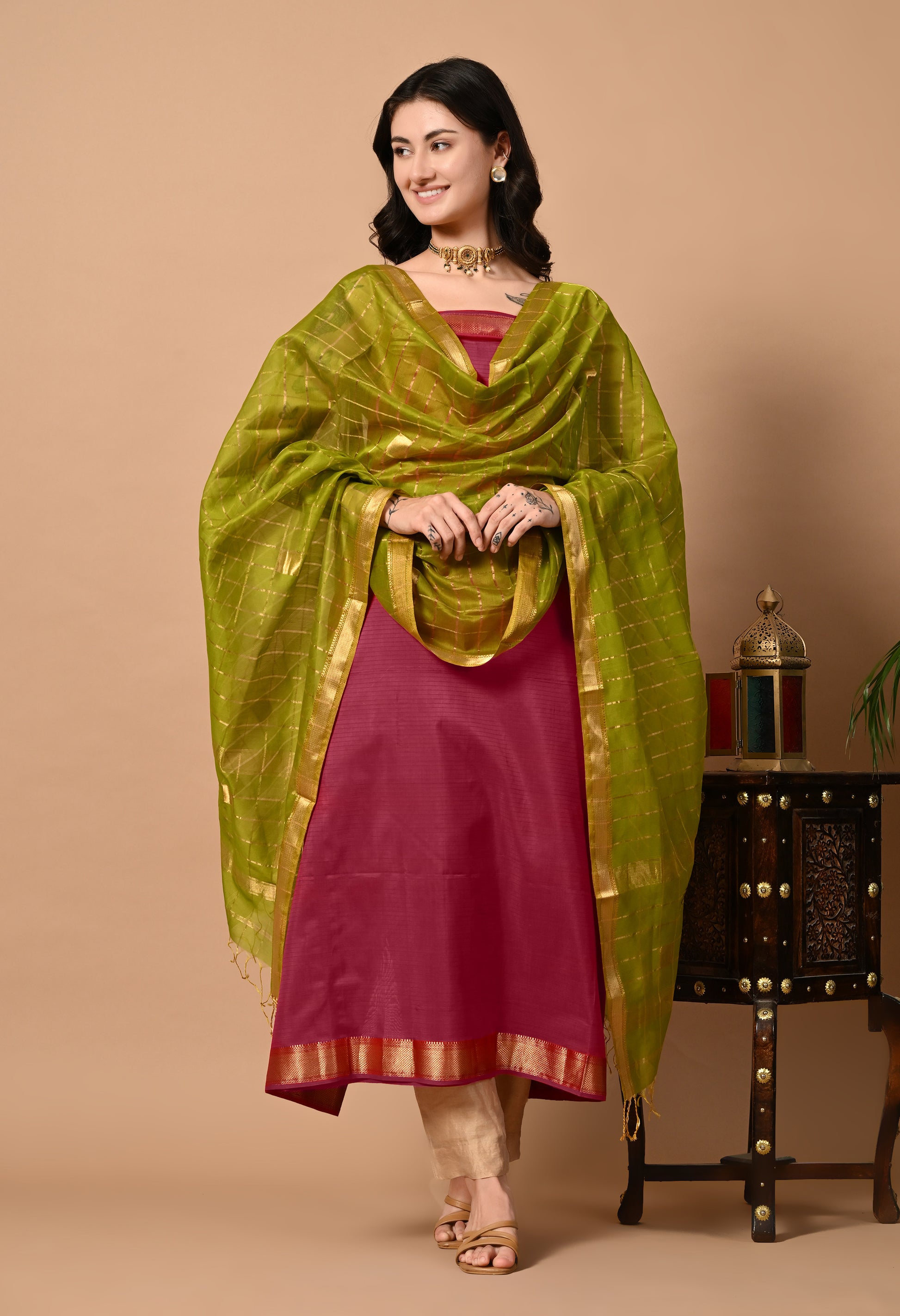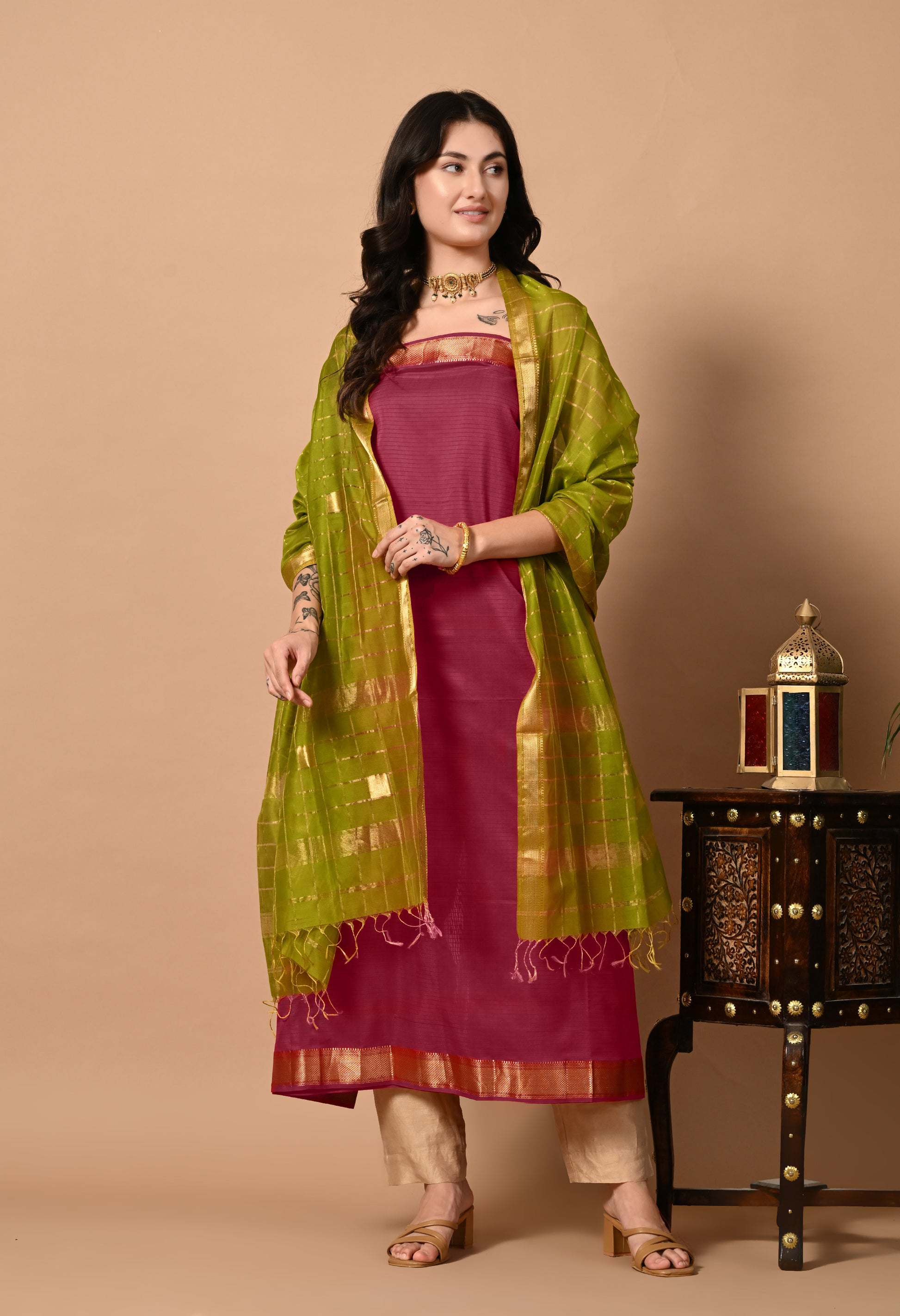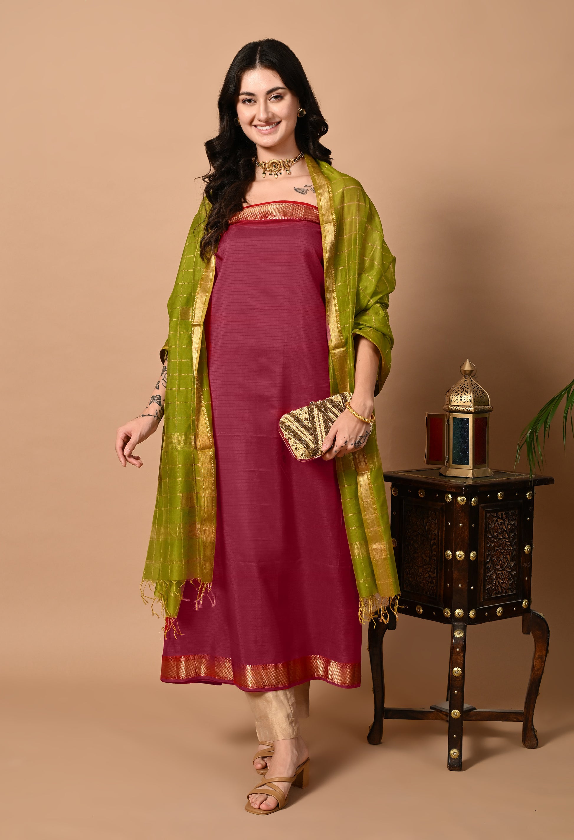 Magenta Maheshwari Handloom Silk and Cotton Kurta Material with Dupatta