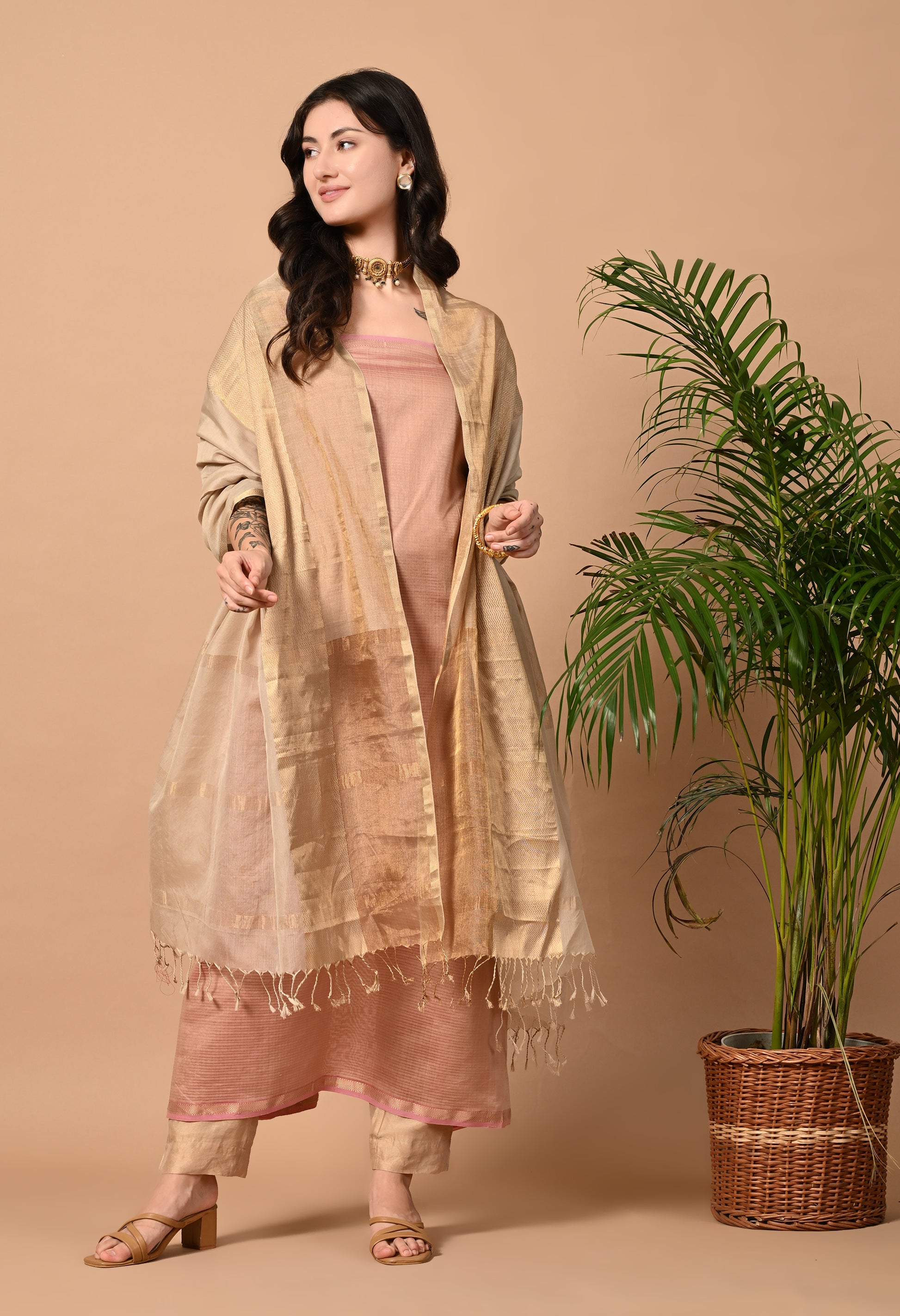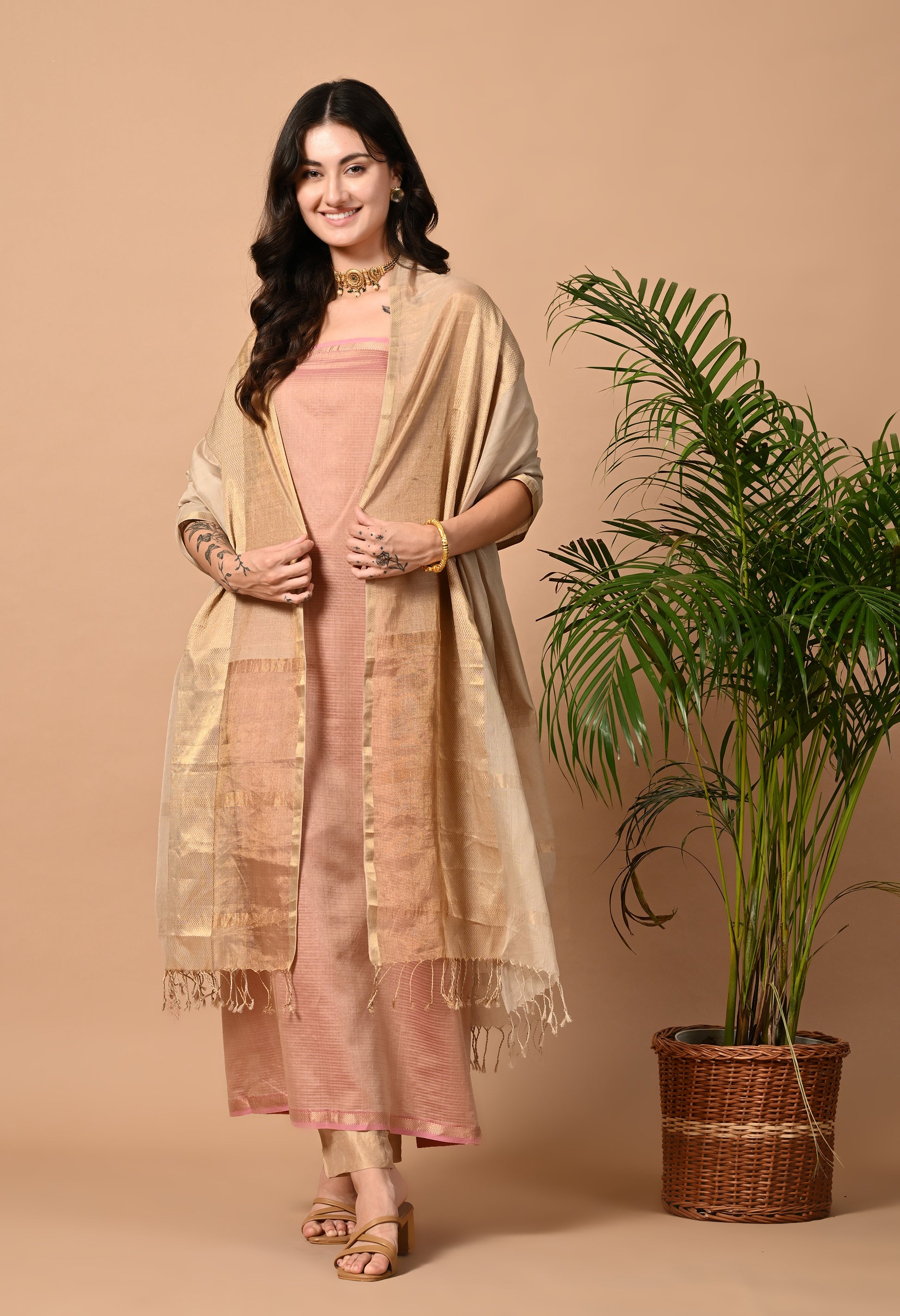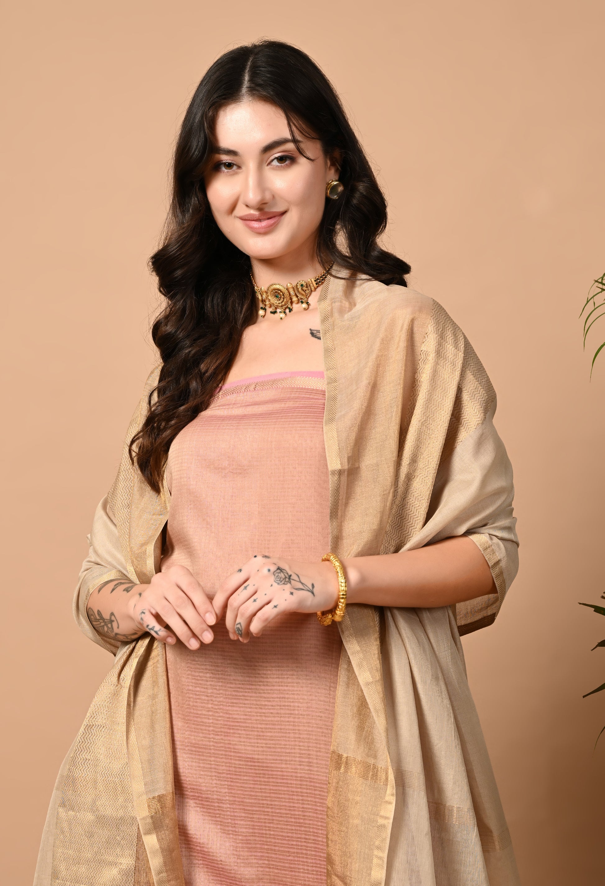 Pink Maheshwari Silk Cotton and Zari Handloom Kurta Material with Golden Dupatta