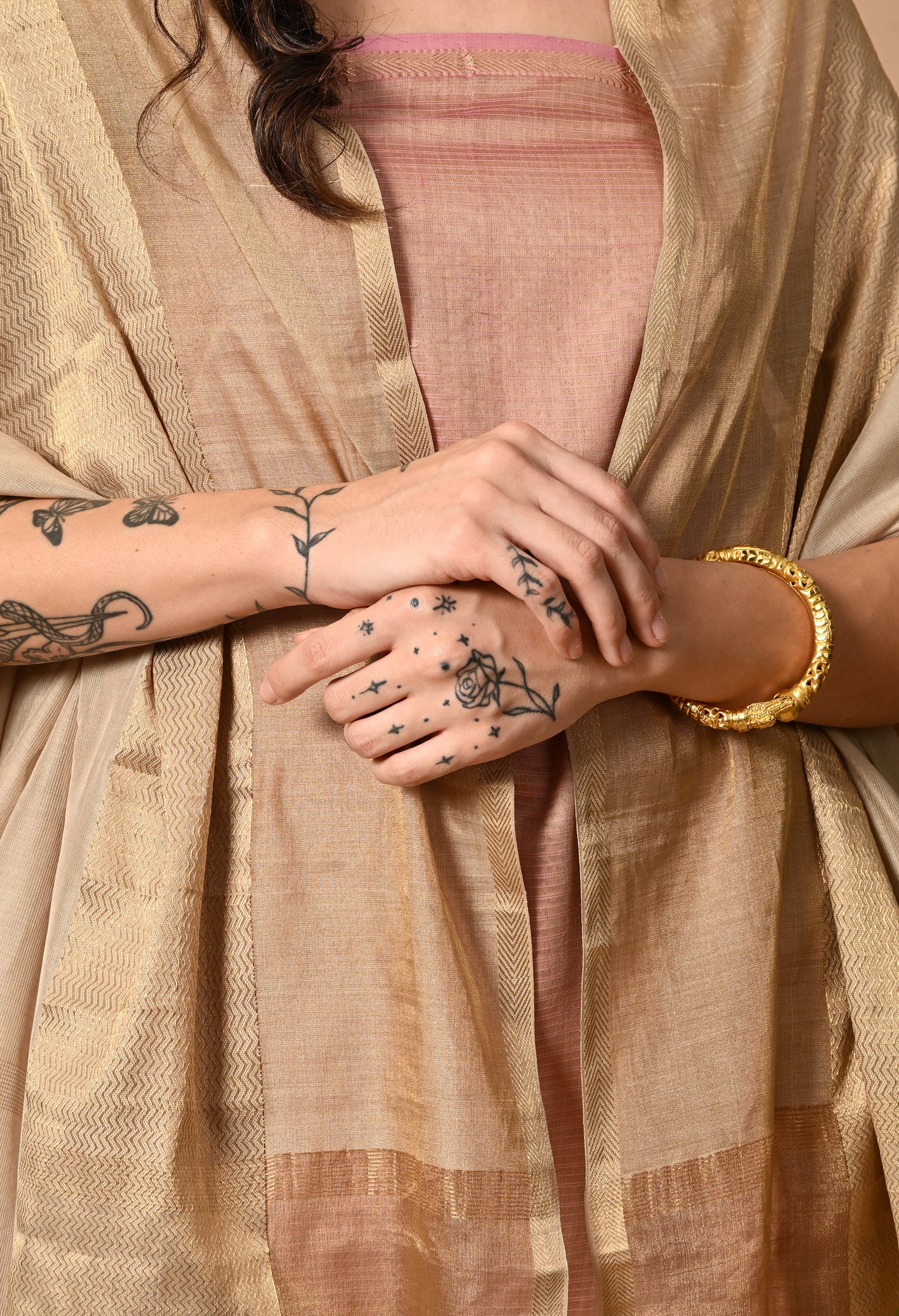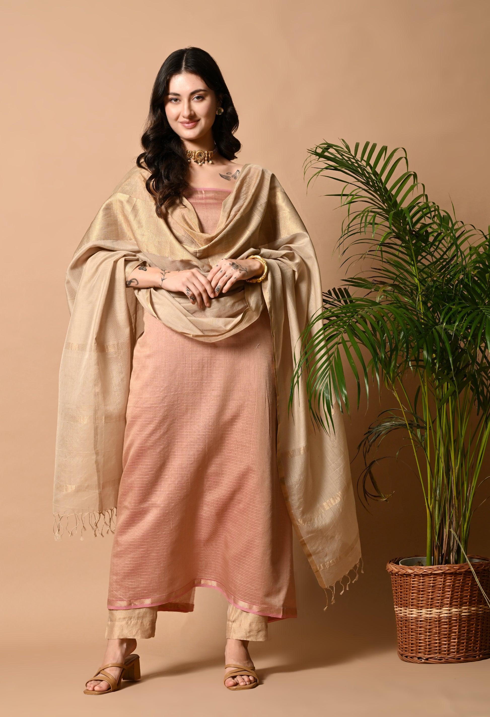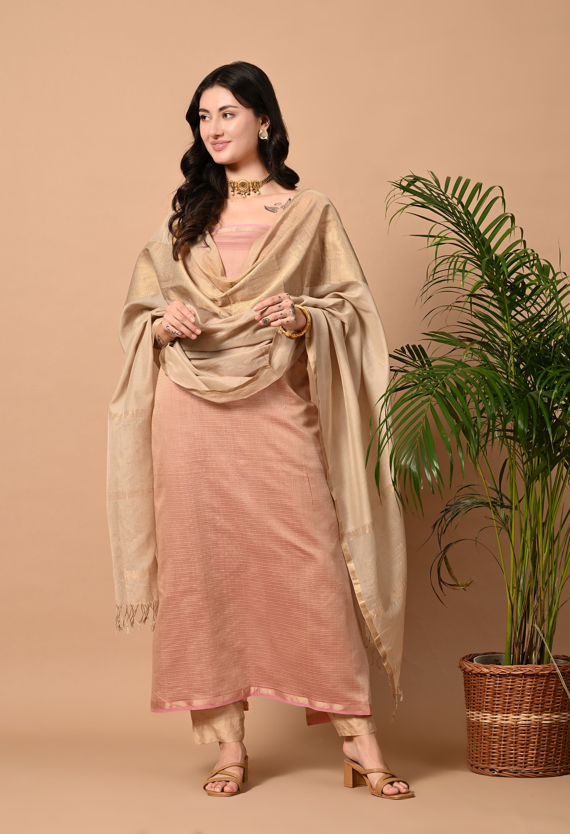 Pink Maheshwari Silk Cotton and Zari Handloom Kurta Material with Golden Dupatta