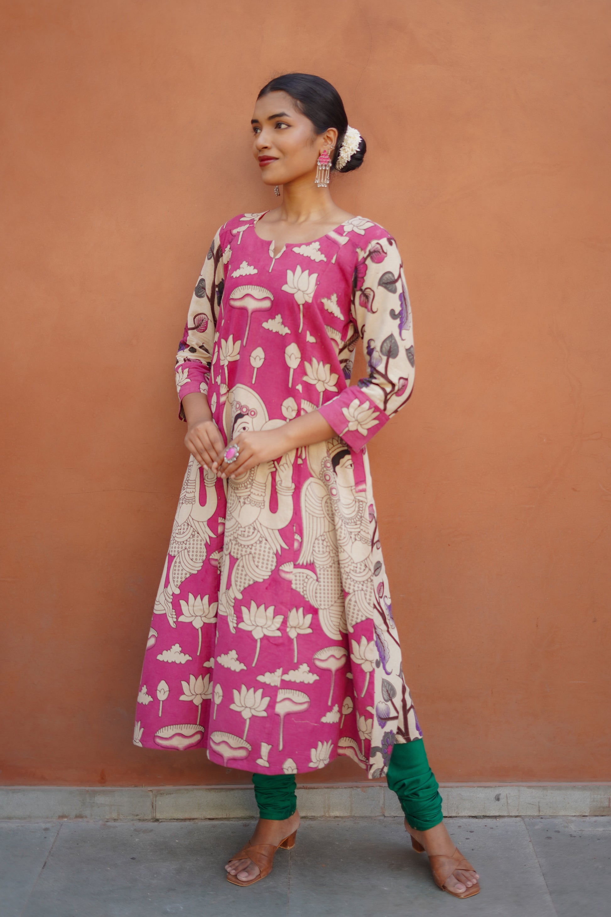 Step into elegance with our magenta Kalamkari cotton kurta, adorned with intricate motifs in the front. Crafted from breathable cotton, this kurta blends traditional artistry with contemporary charm. The rich magenta hue adds a festive touch, while the detailed hand block motifs reflect the timeless beauty of Kalamkari craftsmanship. Perfect for both festive occasions and casual gatherings, this piece keeps you stylish and comfortable all day long.