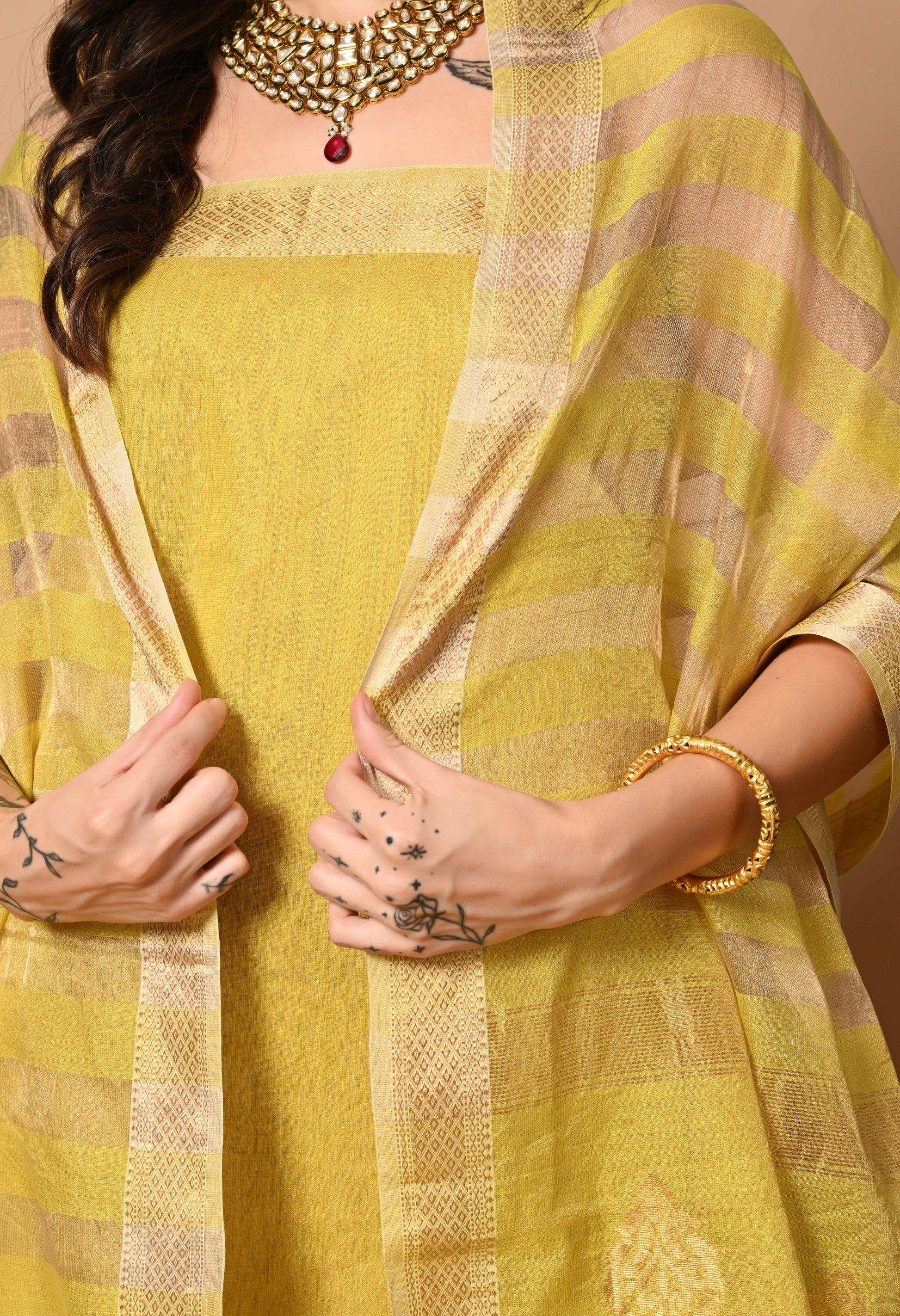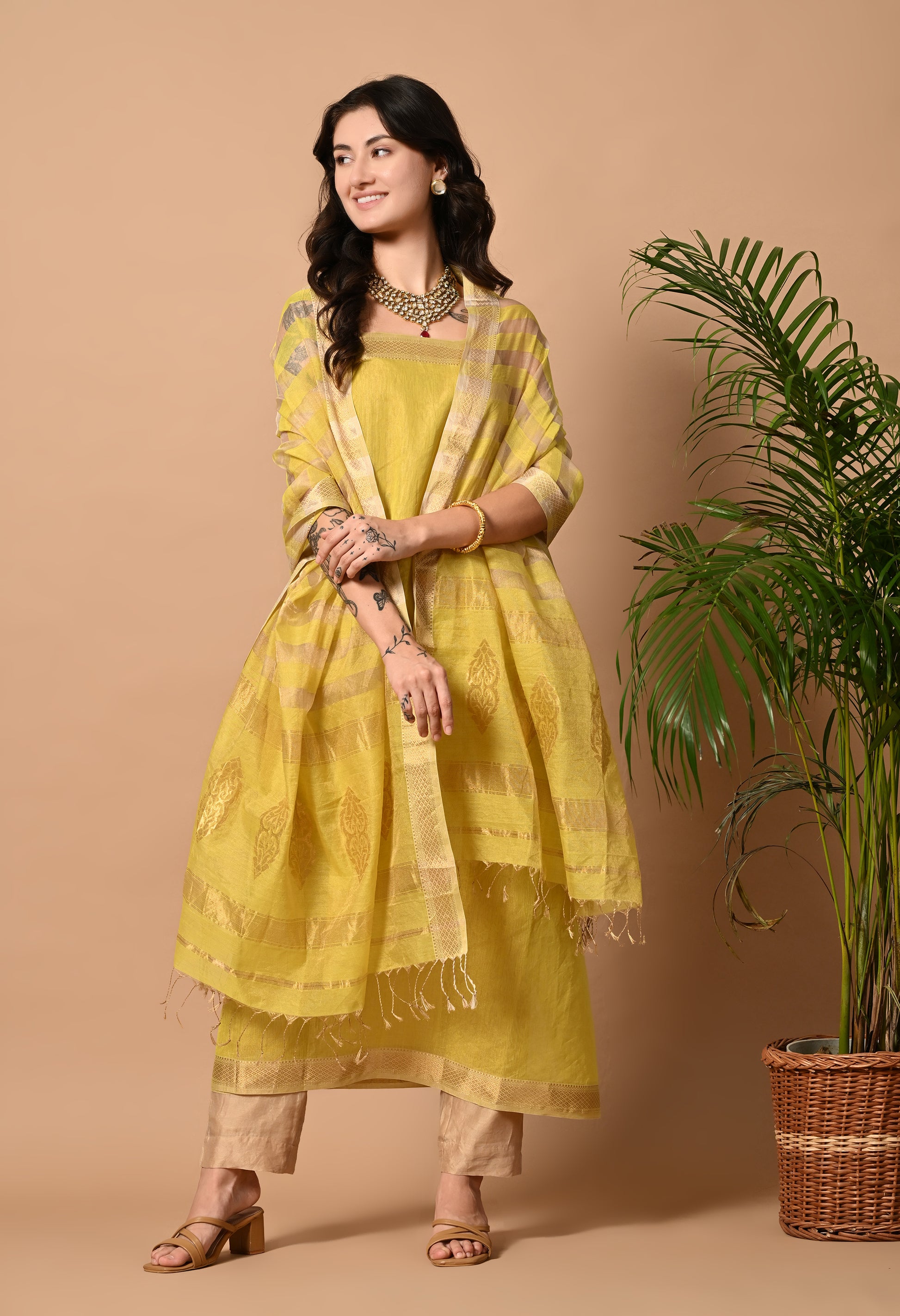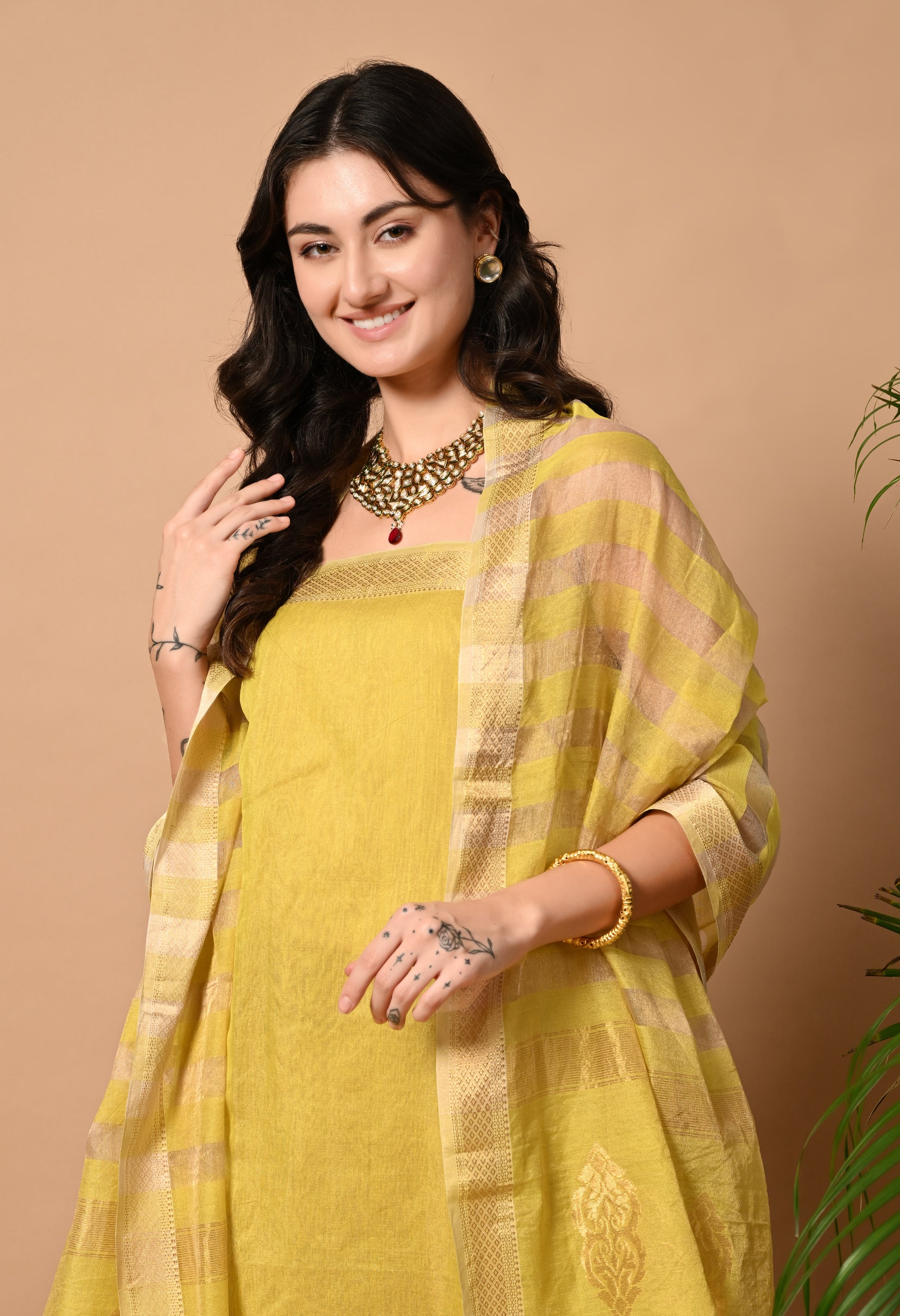 Yellow Maheshwari Handloom Silk ,Zari and Cotton Kurta Material with Dupatta