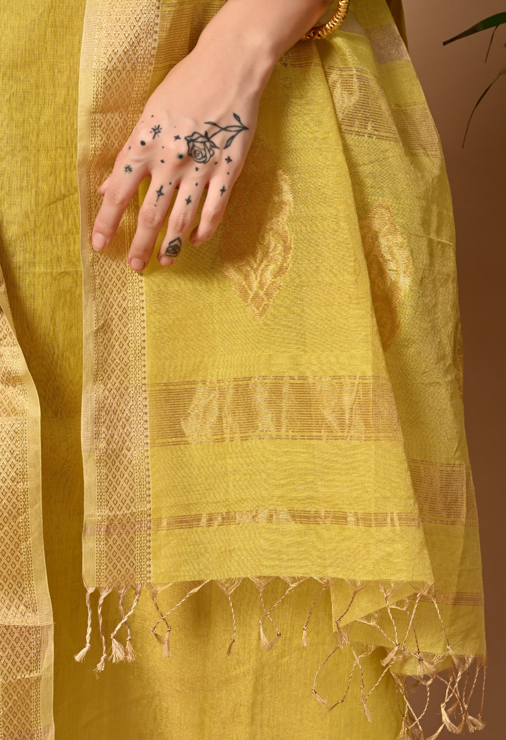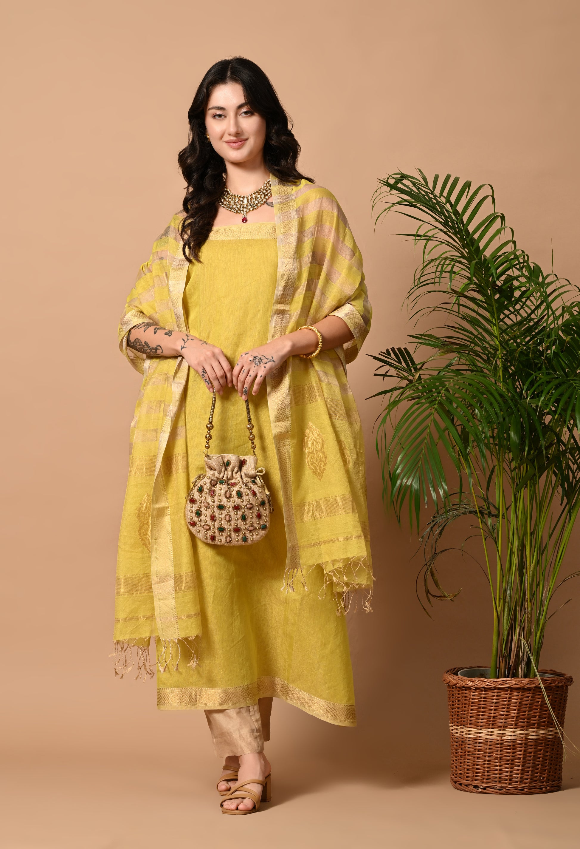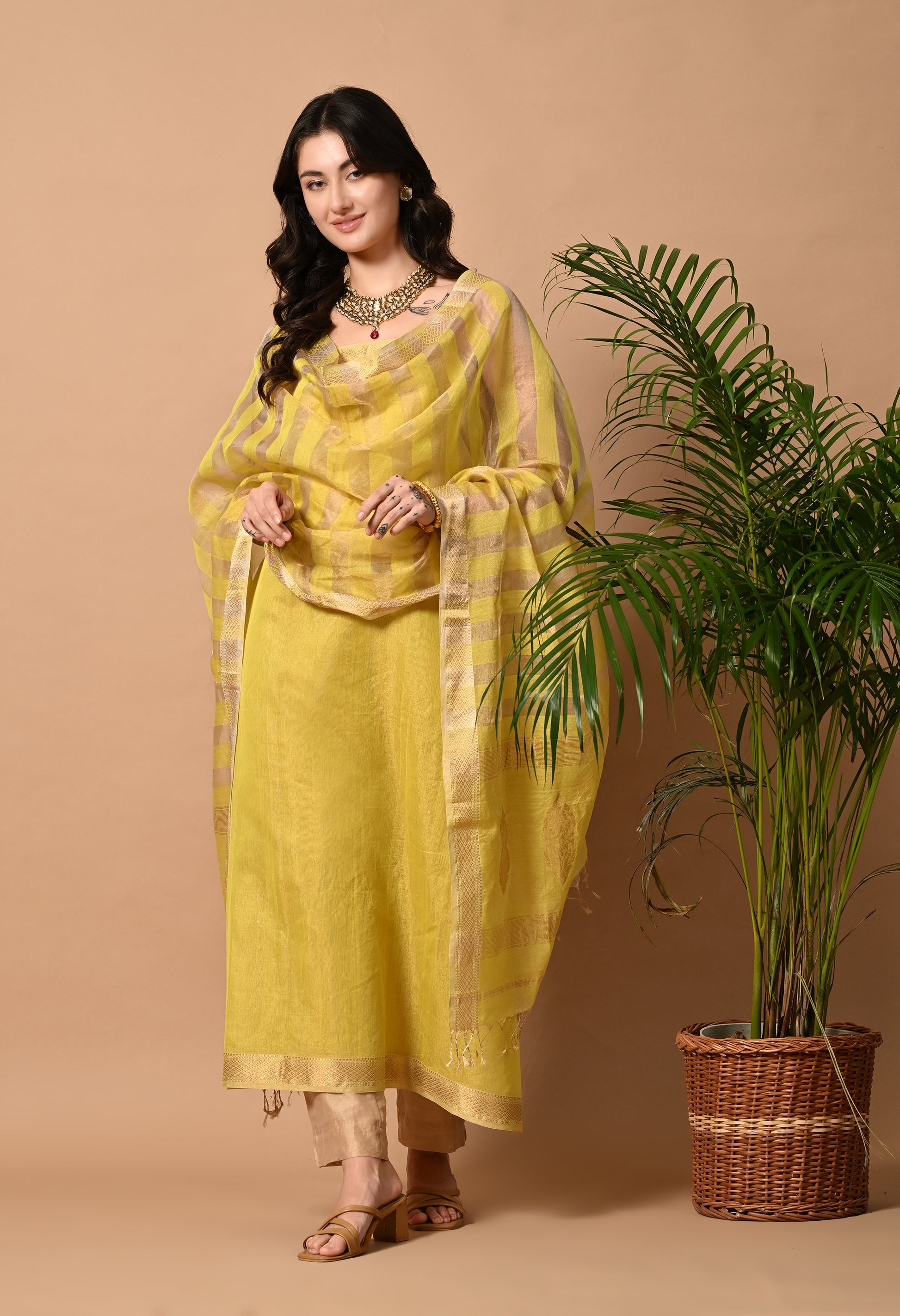 Yellow Maheshwari Handloom Silk ,Zari and Cotton Kurta Material with Dupatta